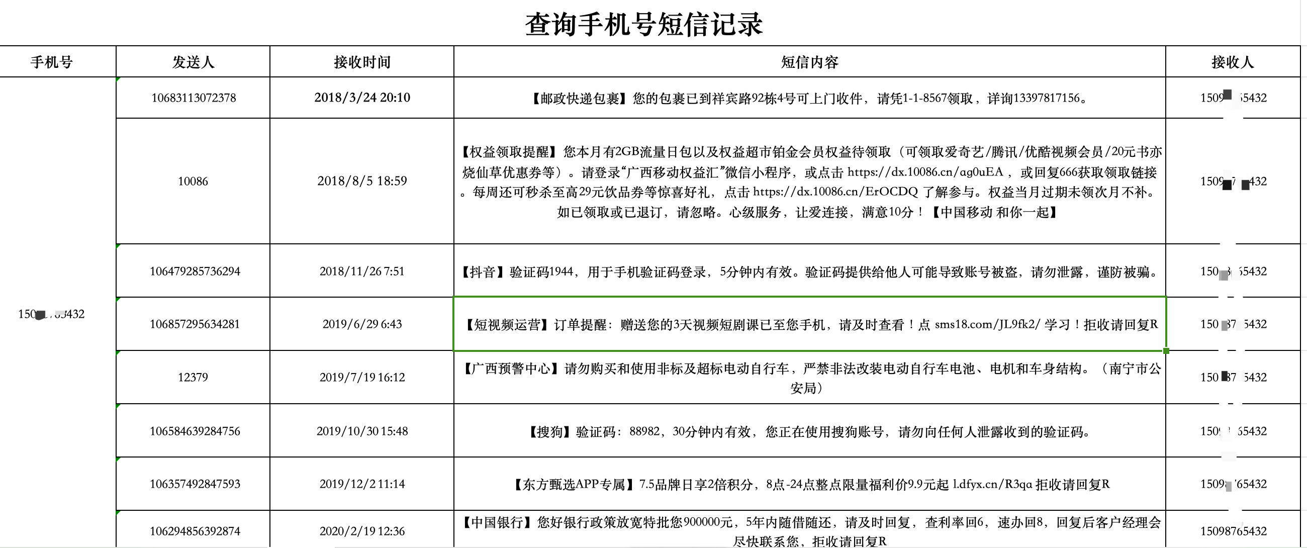 查询发送人信息,接收时间,短信内容,接收人。